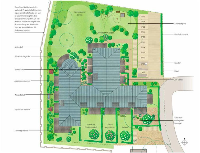 Die siebzig Jahre alten Regierungs-, Verwaltungs- und Militärgebäude werden zu neuem Leben erweckt. Die Gebäude sind in der Denkmalliste des Landes Berlin als vollständig zu erhaltende und das Ortsbild prägende Einzeldenkmale eingetragen. In mehreren Bauabschnitten wird durch den Bauträger die mehr als 56.000 m² große Anlage ergänzt und saniert. Der sechste Bauabschnitt umfasst das abseits der übrigen Gebäude im Nordwesten gelegene ehemalige Finance-Office und Casino „The Pavilion“. Alle Suiten im „The Pavilion“ erhalten Terrassen und Dachterrassen mit Blick in im japanischen Stil gestaltete Hofgärten. Oberirdische Kfz-Stellplätze haben einen Zufahrt von der Saargemünder Straße. Im ehemaligen Hauptgebäude und den übrigen Stabs- und Verwaltungsgebäuden entstehen in weiteren Bauabschnitten Wohn- und Business-Suiten, gut versteckt unter Bäumen. Eine an den Stil New Yorker und Londoner Parks angelehnte Gartengestaltung gibt den Gebäuden einen verbindenden Rahmen. Im „The Pavilion“ sind die Grundsätze japanischer Gartenkunst gestalterische Leitlinien. Auf Ihren Terrassen sitzen die Bewohner zwischen Bambus, Ahornbäumen, Azaleen und in Kiesgärten mit Trögen voller Lilien und Sternmagnolien. |